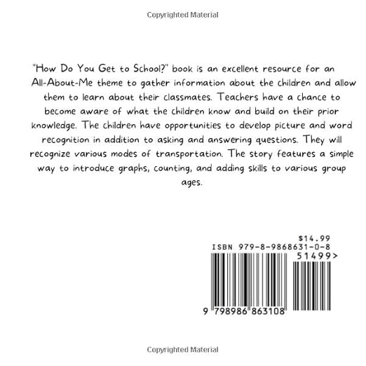 “How Do You Get to School?” book is an excellent resource for an All-About-Me theme to gather information about the children and allow them to learn about their classmates. Teachers have a chance to become aware of what the children know and build on their prior knowledge. The children have opportunities to develop picture and word recognition in addition to asking and answering questions. They will recognize various modes of transportation. The story features a simple way to introduce graphs, counting, and adding skills to various group ages.