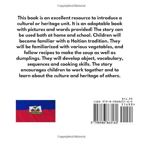 This book is an excellent resource to introduce a cultural or heritage unit. It is an adaptable book with pictures and words provided! The story can be used both at home and school. Children will become familiar with a Haitian tradition. They will be familiarized with various vegetables, and follow recipes to make the soup as well as dumplings. They will develop object, vocabulary, sequences and cooking skills. The story encourages children to work together and to learn about the culture and heritage of others.