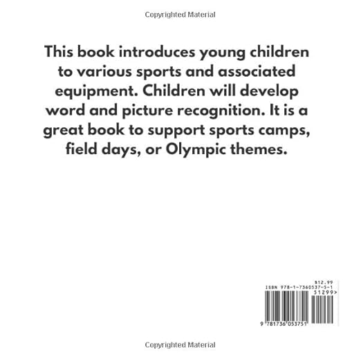 This book introduces young children to various sports and associated equipment. Children will develop word and picture recognition. It is a great book to support sports camps, field days, or Olympic themes.